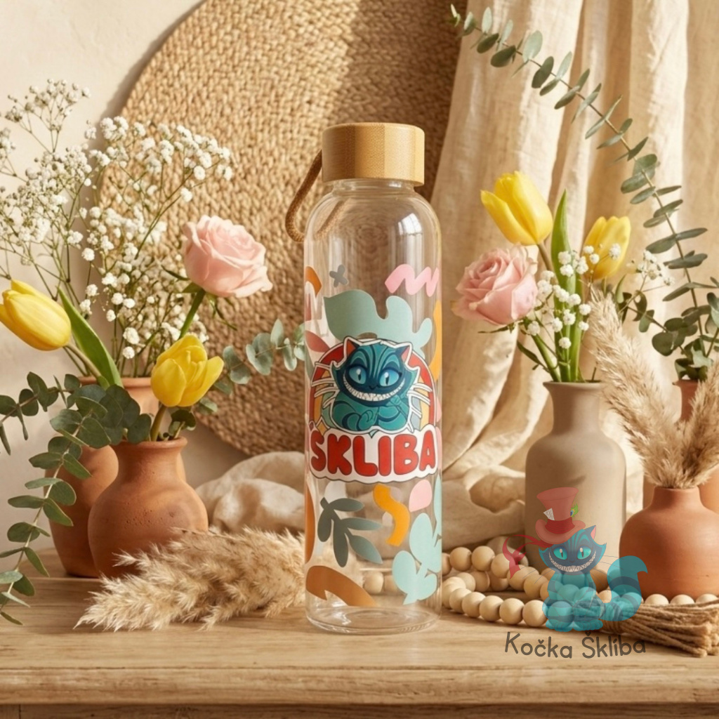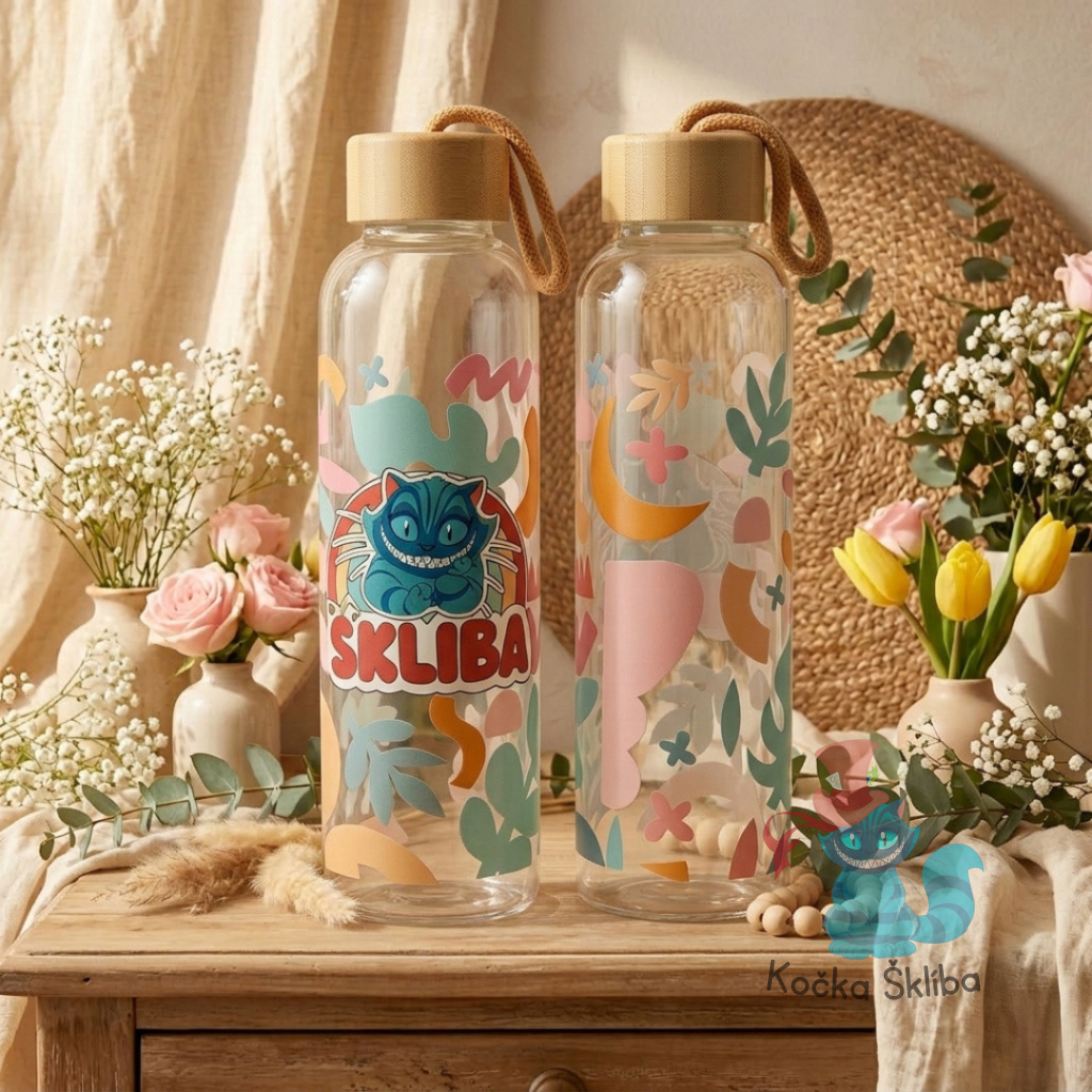 Naše skleněná lahev je důkazem, že i tak obyčejná věc, jako je pitný režim, může být naprostý rituál krásy. Zapomeňte na nevzhledné plasty – tato lahev z odolného skla uchová váš nápoj čerstvý a bez jakýchkoliv pachutí. S motivem Šklíby, která si spokojeně hoví na obláčku, vám bude připomínat, že i v největším shonu je důležité se na chvíli zastavit a osvěžit.