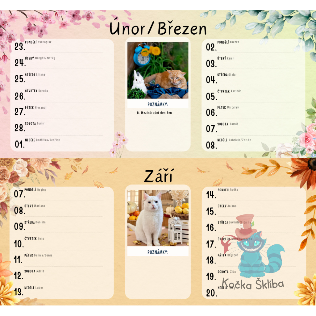 Každou stránku kalendáře zdobí fotografie koček ze Šklíby, které vám zpříjemní pracovní dny i domácí plánování. Ať už jde o hrdý kočičí pohled, něžnou pózu nebo roztomilý detail, každý obrázek vám připomene, že i obyčejné chvíle si zaslouží trochu kouzla.