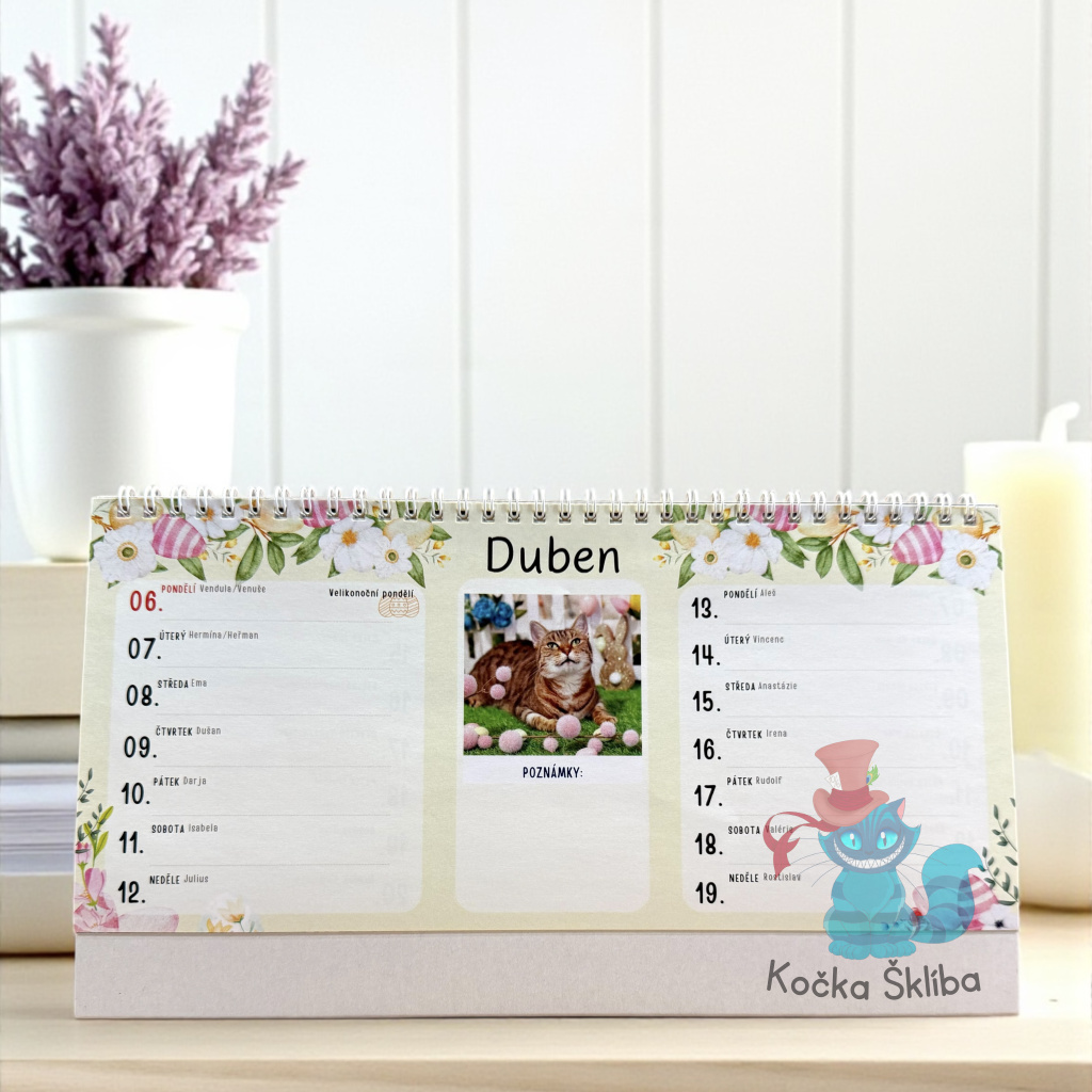 Plánujte s radostí a krásou každý den! 🐾 Náš 14denní stolní kalendář Šklíba je přehledný pomocník, který vám ukáže nejen jmeniny, státní svátky a významné dny, ale také vám vykouzlí úsměv díky fotografiím kočičích obyvatel útulku.