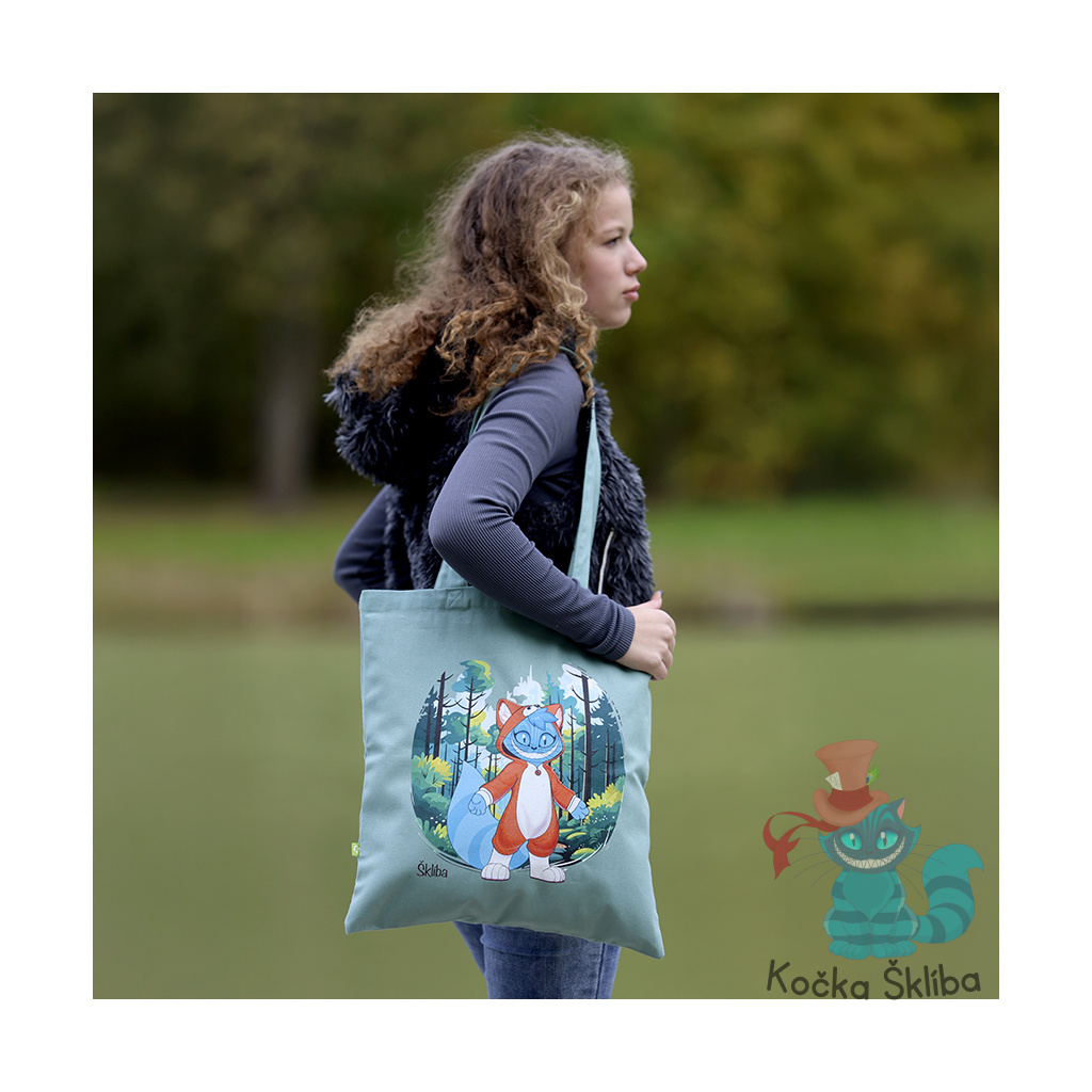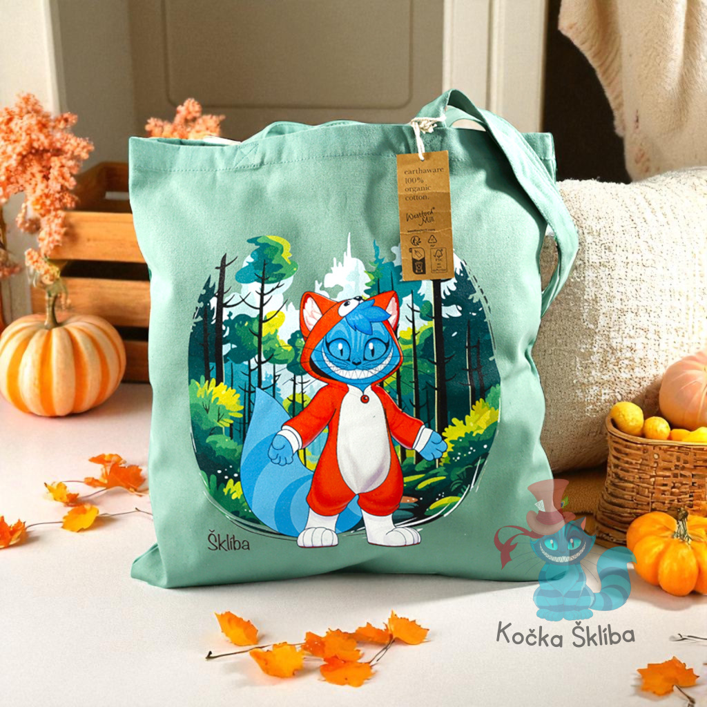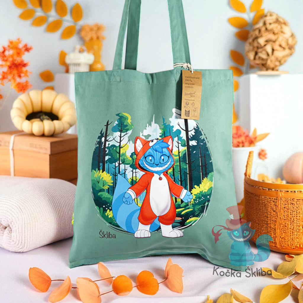 Zkroťte městskou džungli s touto lesně zelenou plátěnou taškou, která je stejně praktická jako pohádková. Středobodem designu je kočka Šklíba převlečená v liščím kostýmu, hrdě stojící mezi stromy a křovinami – zachycený odvážný duch lesa. Tato taška není jen prostor pro Vaše každodenní nezbytnosti, je to také výraz Vašeho příběhu a stylu. Vezměte ji na piknik, trh nebo do knihovny a každým krokem demonstrujte svou lásku k přírodě a umění. Buďte připraveni, že se s tímto originálním doplňkem stane každý den dobrodružstvím.